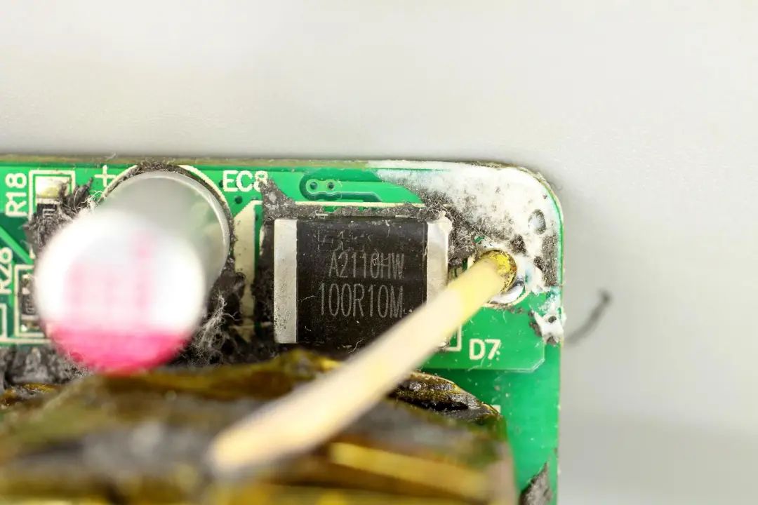 充電器內(nèi)部PCBA模塊采用黃銅散熱片包裹,PCB正面打膠,背面有導(dǎo)熱墊,將熱量傳導(dǎo)至散熱片散發(fā),滿足長(zhǎng)時(shí)間大功率輸出設(shè)計(jì)。初級(jí)濾波電容來自黃寶石,次級(jí)固態(tài)濾波電容來自柏瑞凱,整機(jī)用料均為知名品牌。